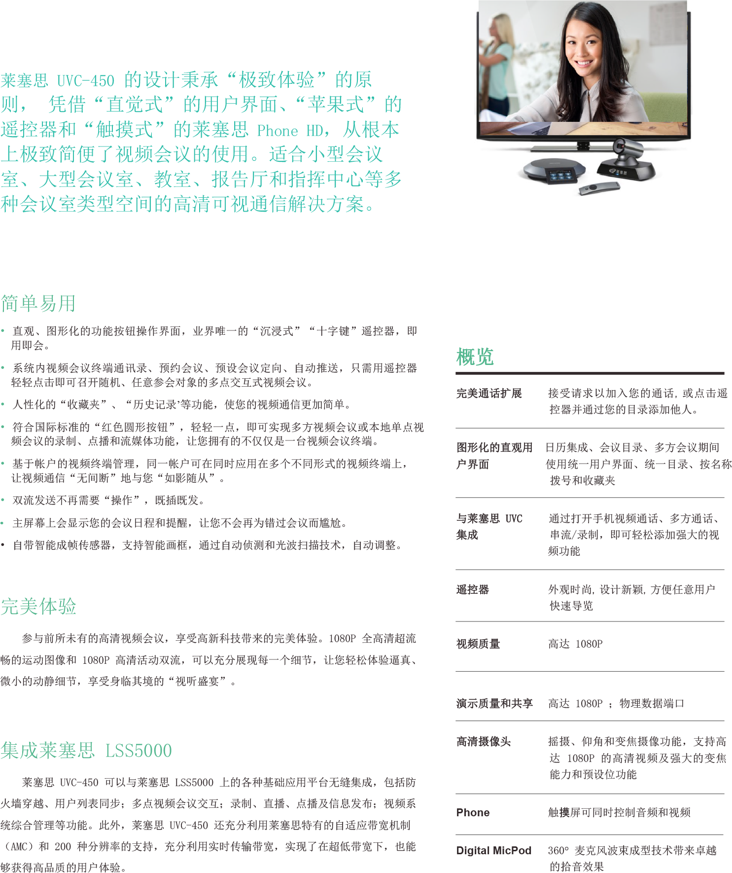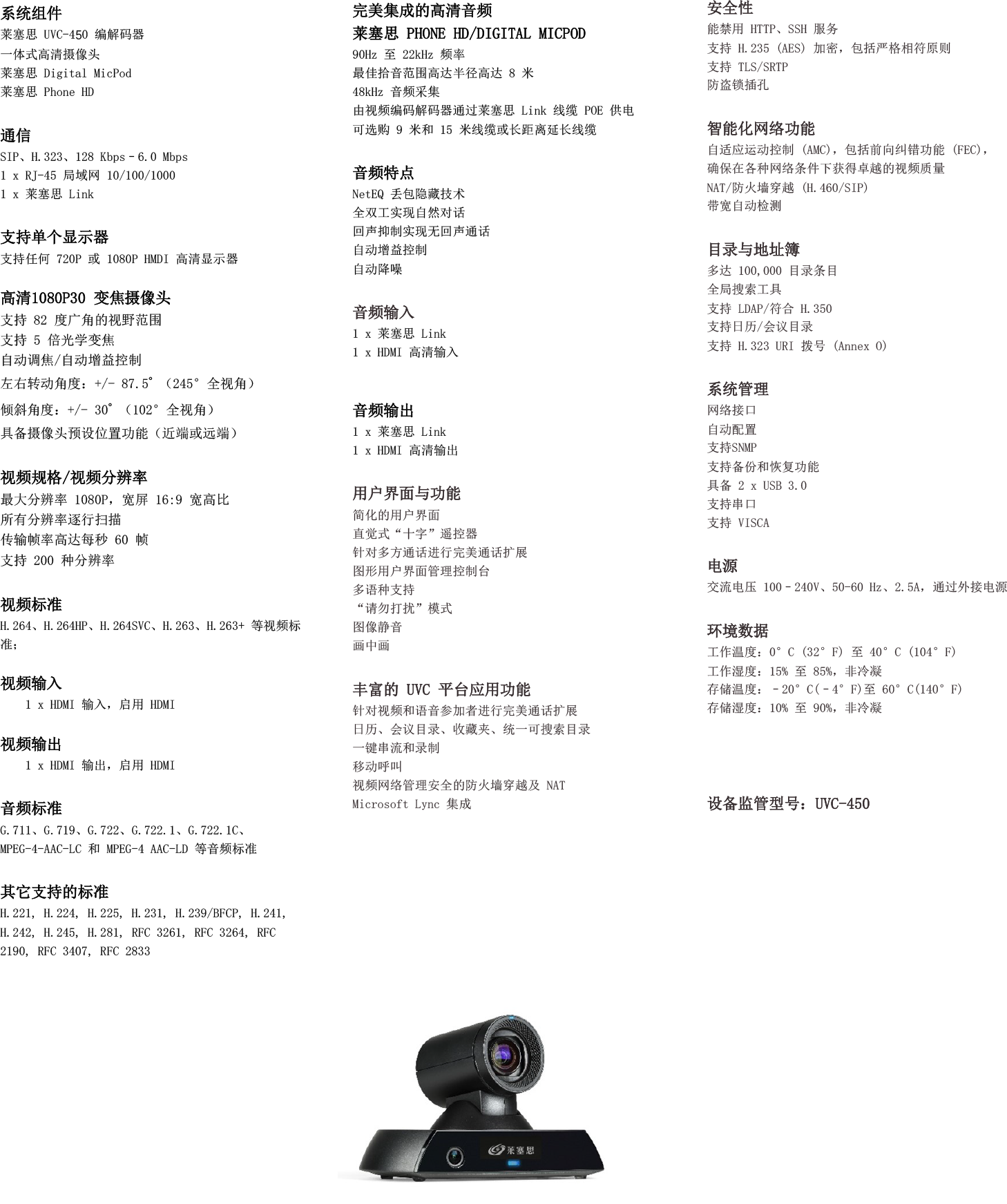UVC-450 高清视频会议终端,是莱塞思针对视频通讯行业的需求,推出的一款超高清一体化 视频会议终端产品。该产品采用嵌入式一体化硬件设计,内置高清摄像单元,统一集成摄像头、 麦克风、扩声及存储,支持 4K 高分辨率解码能力,支持 H.239 双流真彩色图片传输,可将 PC 桌面作为辅流发送。凭借其流畅逼真的高画质及 AAC-LC 宽频语音,给用户带来真正面对面沟通 的视听感受。同时,一体化的硬件设计,安装方便、操作简易,给用户带来最佳的会议协作体验, 是行业用户搭建视频会议系统的首选。